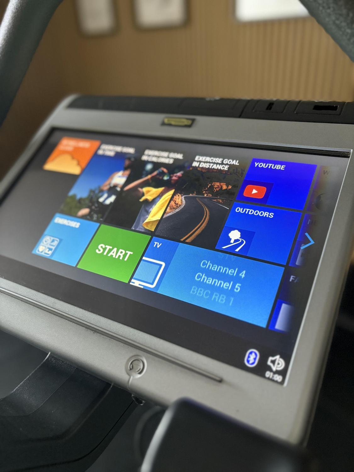 Offers access to internet, TV, virtual training, fitness apps, and real-time workout feedback through a large 16″ HD touchscreen. -